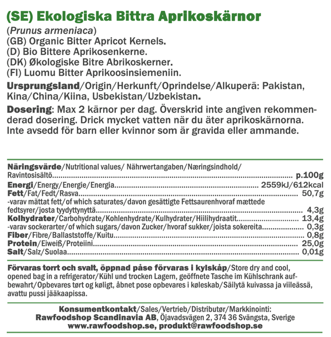 Vores bitre abrikoskerner er både økologiske og certificerede i henhold til EU Organic-standard, hvilket garanterer, at de er produceret på en bæredygtig måde. Disse abrikoskerner kommer fra søde/sure abrikoser og indeholder amygdalin (laetril), hvilket giver dem en unik smag, der minder om bittermandel.