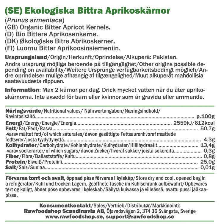 Vores bitre abrikoskerner er både økologiske og certificerede i henhold til EU Organic-standard, hvilket garanterer, at de er produceret på en bæredygtig måde. Disse abrikoskerner kommer fra søde/sure abrikoser og indeholder amygdalin (laetril), hvilket giver dem en unik smag, der minder om bittermandel.