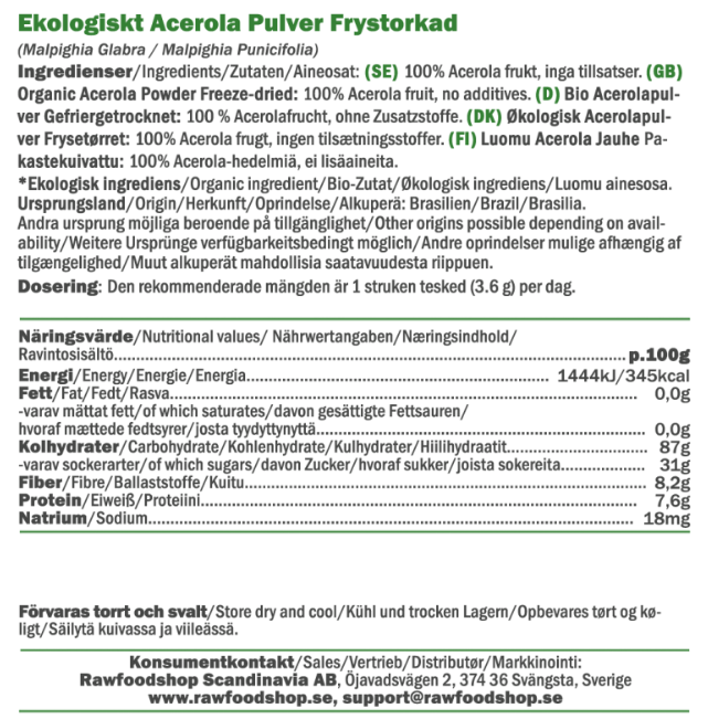 Acerolapulver er alsidigt og passer fremragende i en række forskellige retter og drikke. Dens naturligt syrlige smag gør det til en fremragende ingrediens i smoothies, hvor det kan give et frisk twist til frugtbaserede blandinger. Bland gerne pulveret med banan, mango og kokosvand for en eksotisk smoothie, der minder om tropiske strande. Denne saftige og syrlige frugt er en populær ingrediens i Brasilien, hvor acerola-juice er lige så almindeligt som appelsinjuice her i Europa. Pulverformen gør det nemt at integrere i din daglige kost. Vores acerolapulver er råtørret, eller rawfood, vegansk og økologisk certificeret i henhold til EU's standarder.