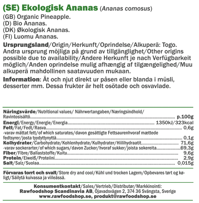 Oplev smagen af solmoden ananas med vores økologiske og tørrede ananas. Denne usødede delikatesse tilbyder en naturligt sød og syrlig smag, perfekt bevaret gennem skånsom tørring. Vores ananas er råtørret eller rawfood, vegansk og certificeret i henhold til EU Organic-standarden, hvilket garanterer høj kvalitet. Produkter kan komme i stykker og variere i størrelse afhængigt af batch, men den vidunderlige aroma og smag er altid den samme.