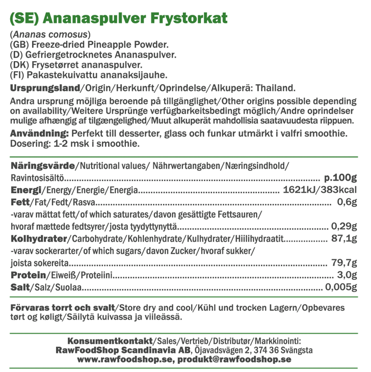 Ananaspulver er en alsidig og aromatisk ingrediens, der hurtigt har fundet vej til det veganske køkken og rawfood-opskrifter. Med sin intense frugtsmag og naturlige sødme giver det dine retter et friskt, tropisk løft – uanset om det er hverdag eller fest. Drys lidt over frisk frugt, rør det i chiagrød eller blend det i smoothies for en eksotisk smagsoplevelse. Kombinér det gerne med andre tropiske frugter som mango eller papaya, og skab dine egne kreative frugtblandinger og forfriskende drikke. Elsker du at eksperimentere i køkkenet? Så er ananaspulveret den perfekte genvej til nye smagskombinationer – både søde og syrlige.