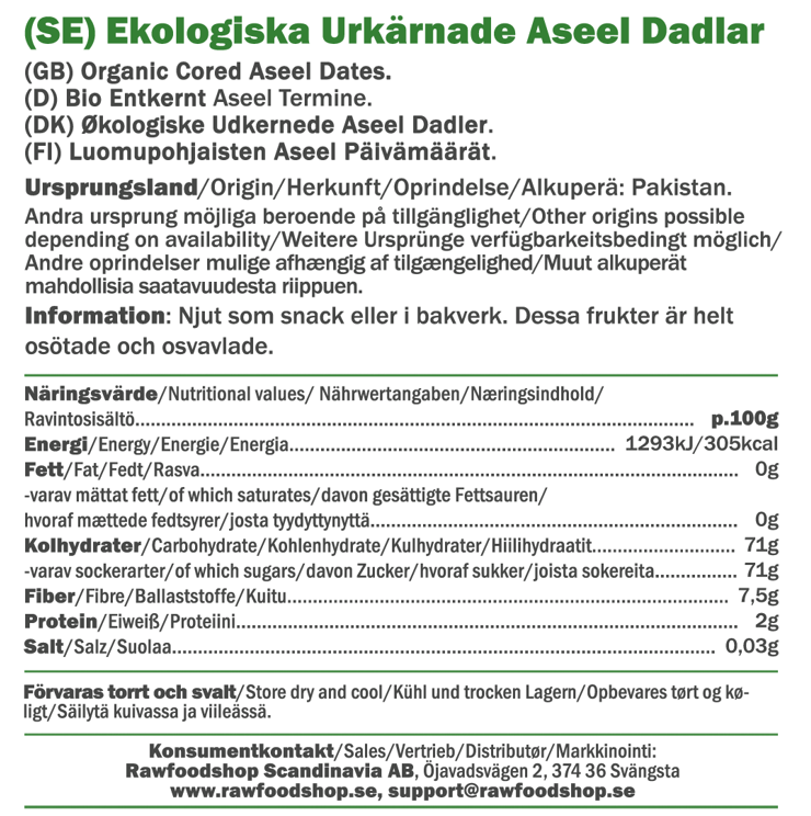 Aseel-dadler adskiller sig fra andre sorter, som Medjool-dadler, ved deres størrelse og smag. Aseel-dadler er mindre og mørkere, med en intens sødme og dyb karamelton. Hvor Medjool-dadlerne er kendt for deres store størrelse og næsten cremede tekstur, tilbyder Aseel-dadlerne en mere koncentreret smag i et kompakt format. De er perfekte for dig, der leder efter lette råvarer at bruge i vegansk madlavning og bagning, eller som en lille men smagfuld snack. Den råtørrede proces bevarer alle naturlige smage og giver dadlerne en lidt sejere konsistens sammenlignet med Medjool-dadler.