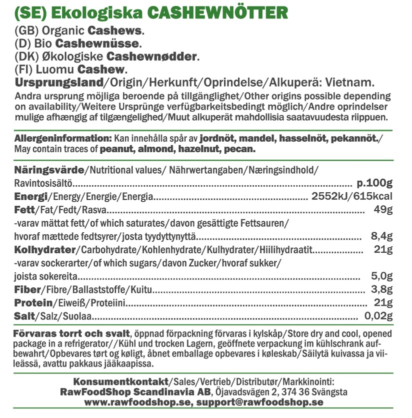 EU Organic-certificeringen sikrer, at produktet er dyrket i henhold til strenge økologiske retningslinjer, hvilket betyder, at det er fri for syntetiske pesticider, og at det produceres med fokus på bæredygtighed. Dette gør vores cashewnødder til et fremragende valg for dig, der værdsætter økologiske produkter af høj kvalitet.