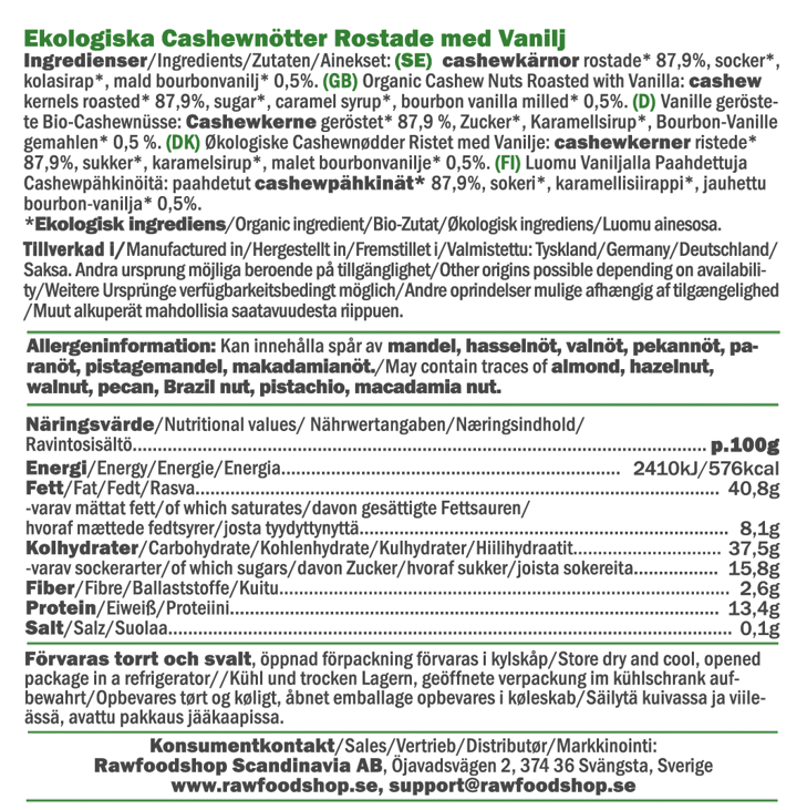 Disse ristede cashewnødder er et lille unikt smagseventyr. Den nænsomme ristning fremhæver nøddernes naturlige sprødhed, mens vaniljens rige aroma og karamelens sødme skaber en harmonisk balance. De egner sig perfekt som topping på desserter eller frugtsalater for et luksuriøst twist – eller nydes direkte fra posen. Nødderne er også en lækker tilføjelse til bagværk, hvor de tilfører både smag og tekstur. Prøv dem som topping på is eller i hjemmebagte småkager for en ekstra luksuriøs smag. Den søde vaniljetone gør dem til en favorit blandt alle, der elsker kombinationen af sødme og nøddearoma.