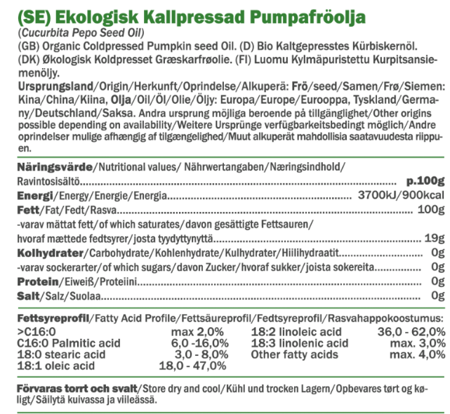 Vores koldpressede græskarfrøolie er en naturlig, økologisk planteolie med en smuk, dybgrøn farve og en intens, nøddeagtig smag. Fordi den er koldpresset, bevares den unikke smag fra græskarfrøene på bedste vis. Olien er særligt følsom over for varme og bør derfor anvendes i kolde retter – den er perfekt i salater, marinader eller som en smagsfuld finish på supper. Den gør sig også rigtig godt i bagværk, hvor den tilfører en spændende og aromatisk dybde. Et simpelt og økologisk valg, der løfter hverdagsmaden. Opbevar gerne græskarfrøolien i køleskab eller et køligt, mørkt skab for at bevare friskheden. Den mørke flaske beskytter mod lys og forlænger oliens holdbarhed og smag.
