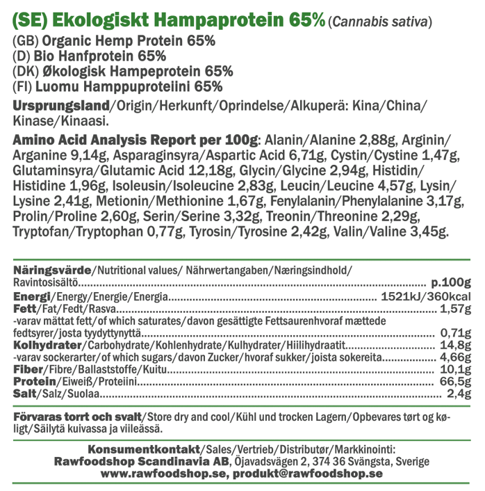 Prøv Hampeprotein 65% ØKO – et proteinpulver af høj kvalitet, fremstillet af nøje udvalgte hampefrø. Med sin milde, nøddeagtige smag er dette veganske proteinpulver en perfekt ingrediens i smoothies, bagværk og madlavning. Uanset om du vil eksperimentere med proteinpulver-opskrifter eller blot ønsker at berige din daglige kost med et naturligt alternativ, er hampeprotein et fremragende valg.