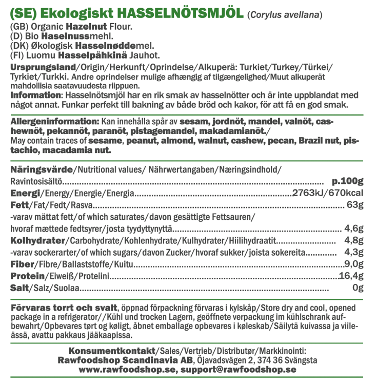 Vores ristede hasselnøddemel er certificeret i henhold til EU Organic-standard, hvilket betyder, at det er fremstillet uden syntetiske bekæmpelsesmidler og med respekt for naturen. Når du vælger vores hasselnøddemel, får du ikke kun et produkt af højeste kvalitet, men også et miljøvenligt alternativ, som du kan føle dig tryg ved. Med sin oprindelse i økologisk dyrkede hasselnødder er dette mel et bæredygtigt og lækkert valg til alle dine glutenfri og veganske bagværk.