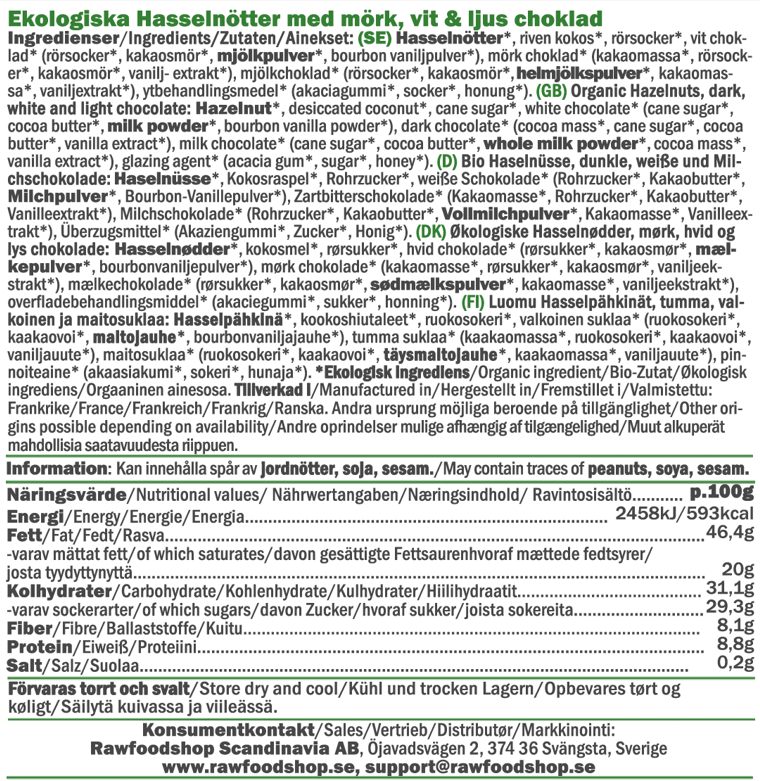 Med tre forskellige slags økologisk chokolade får hver enkelt hasselnød sin helt egen smagsprofil – fra den intense mørke chokolade, til den bløde sødme i den hvide og den velafbalancerede lys chokolade. Alt går op i en højere enhed i et moderne, men tidløst udtryk. Hasselnødder Mørk, Hvid og Lys Chokolade ØKO er det oplagte valg til dig, der sætter pris på kvalitet og gennemtænkt smag. En must-have for enhver, der elsker ristede hasselnødder i perfekt samspil med økologisk chokolade.