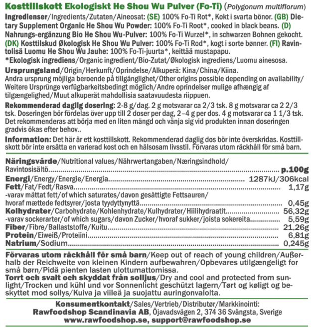He Shou Wu er et økologisk og vegansk kosttilskud fremstillet af He Shou Wu, også kendt som Fo-Ti. Rødderne er tilberedt efter traditionel metode, hvor de koges sammen med sorte bønner. Kosttilskuddet er nænsomt forarbejdet for at sikre høj kvalitet og indeholder hverken tilsætningsstoffer eller fyldemidler.