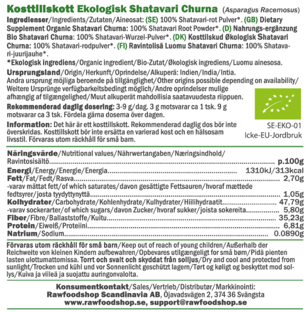 Shatavari Churna er et vegansk og økologisk kosttilskud med rodpulver fra Asparagus racemosus – en art af asparges med oprindelse i Sri Lanka, Indien og Himalaya. Shatavari Churna anvendes traditionelt inden for ayurveda. Den nøje udvalgte råvare males skånsomt til et fint pulver for at bevare rodens naturlige karakter. Produktet er helt fri for tilsætningsstoffer.