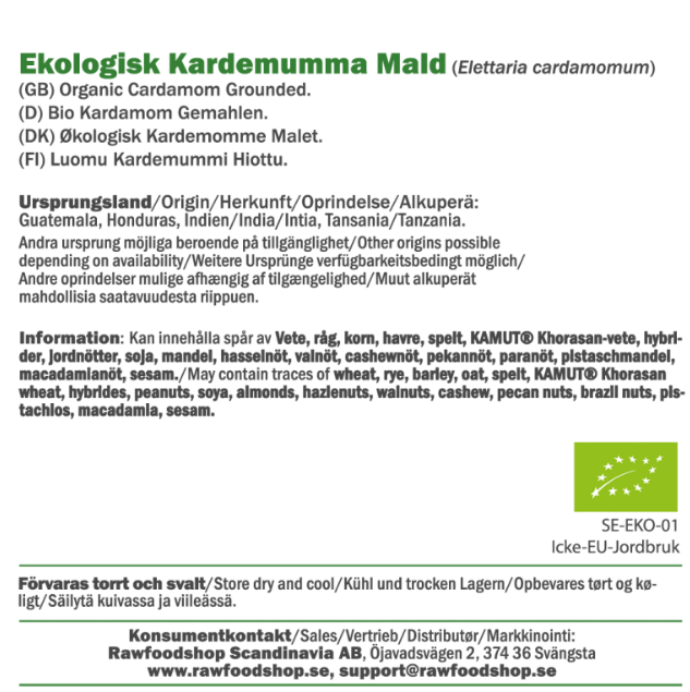Økologisk malet kardemomme er et krydderi med en varm og aromatisk smag, der bruges over hele verden i madlavning og bagning. Den finmalede konsistens gør det nemt at bruge i alt fra bagværk til drikkevarer. Oprindeligt fra Sydøstasien er kardemomme et af verdens mest værdsatte krydderier og en uundværlig del af mange traditionelle opskrifter.