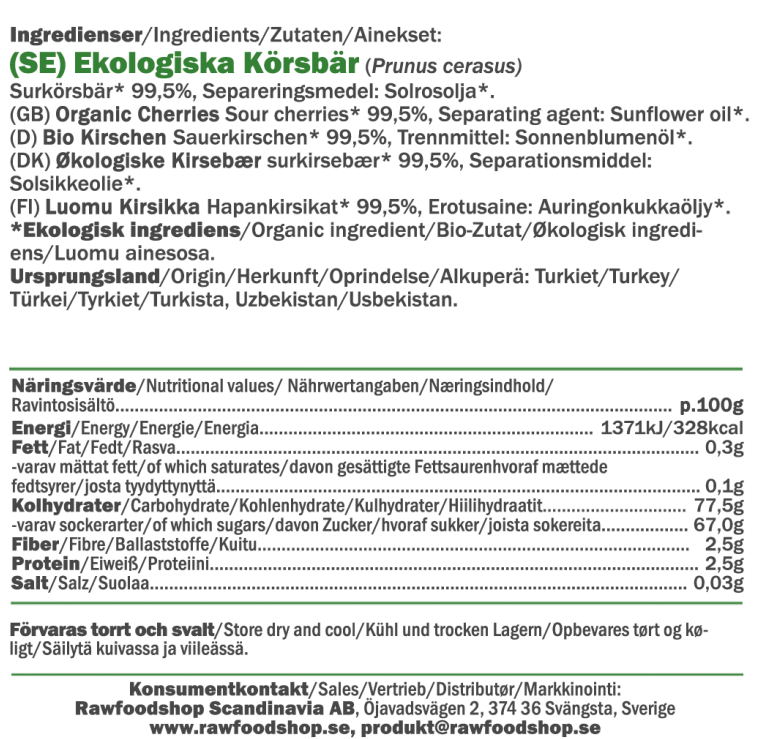 Vores tørrede kirsebær er omhyggeligt udvalgte surkirsebær, økologisk dyrkede og nænsomt råtørrede for at bevare deres syrlige smag og naturlige karakter. Med deres afbalancerede syrlighed og sødme er de et fremragende indslag i både søde og salte retter. Pakket i en generøs 500g pose, er disse råtørrede kirsebær et lækkert, vegansk alternativ for dig, der ønsker at leve en mere bæredygtig livsstil.