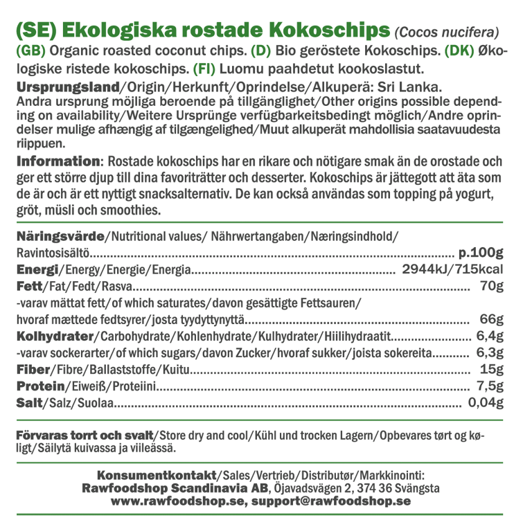 Er du en kokoselsker? Så vil vores økologiske ristede kokoschips garanteret blive din nye favorit. De har en dybere og mere intens smag end uristede kokoschips, med en herlig nøddeagtig tone og ekstra meget crunch. Ristningen fremhæver kokossmagen og giver et let karamelliseret touch, hvilket gør dem til et perfekt supplement i både madlavning og bagning. Certificerede i henhold til EU Organic-standard, er vores kokoschips ikke kun lækre, men også bæredygtigt producerede.
