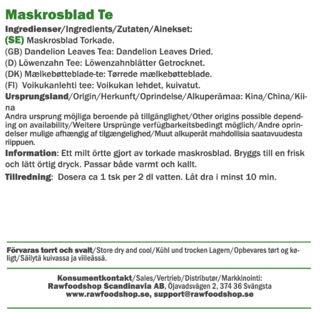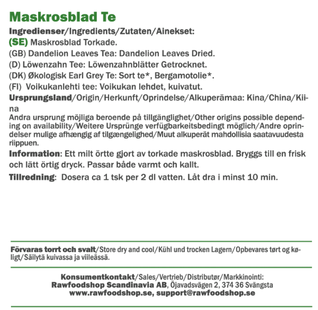 Mælkebøtteblad-te eller mælkebøtte-te, brygget på råtørrede mælkebøtteblade, er en naturlig urte-te med en mild, let bitter smag, der minder om nordiske enge og vilde urter. Mælkebøtte, som længe har været en værdsat ingrediens i nordisk mad og drikke, er nu populær igen og bruges både i te, salater og friske juicer. Med denne te af mælkebøtteblade kan du nemt nyde mælkebøttens naturlige smag. Vores tørrede mælkebøtteblade er omhyggeligt udvalgt for at sikre en smagfuld kop te, perfekt til dig, der sætter pris på naturlige urte-teer.