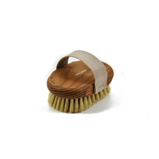 Massagebørste Asktræ er en håndlavet børste i naturmateriale fra Frankrig, skabt til både massage og mild peeling. Det varmebehandlede asketræ har en dyb chokoladebrun glød, som ikke bare giver børsten et elegant udtryk, men også gør den mere modstandsdygtig over for vand og fugt. Med sin rummelige størrelse, naturlige fibre og praktiske vævede bomuldsrem er den det ideelle redskab til tørbørstning og naturlig hudpleje i hverdagen.