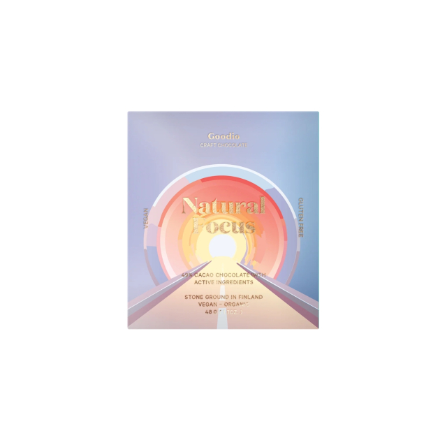 Natural Focus er en chokolade med 49 % kakao og en fyldig, rund smagsprofil. Hver plade indeholder nøje udvalgte ingredienser som guarana, maca og matcha i kombination med kakao. Vegansk og glutenfri chokolade med blød konsistens og tydelig kakaokarakter, håndlavet i Finland.