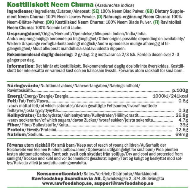 Neem Churna er et vegansk kosttilskud fremstillet af 100 % fintmalede neem-blade (Azadirachta indica). Neem anvendes inden for ayurveda. Ved udelukkende at bruge blade fra neem-træet sikres et pulverbaseret kosttilskud af høj kvalitet uden unødvendige tilsætningsstoffer. Takket være sin naturlige sammensætning er Neem Churna et fremragende valg for dig, der ønsker et plantebaseret kosttilskud.