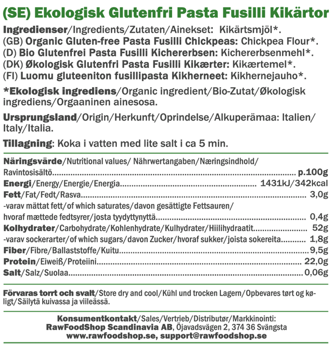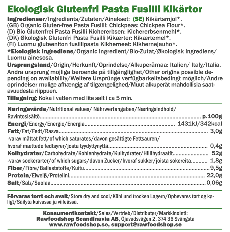 Pasta Fusilli Kikærter ØKO er det oplagte valg for dig, der vil lave lækre og naturlige retter – helt uden gluten. Denne økologiske kikærtepasta består kun af én ingrediens: økologisk kikærtemel. Det betyder ingen unødvendige tilsætningsstoffer og masser af naturlig smag. Den klassiske fusilli-form fanger saucen perfekt og egner sig både til kolde og varme retter. Med sin faste konsistens og milde smag er den et fremragende alternativ til traditionel pasta – især hvis du er på udkig efter nye idéer til veganske retter eller vil prøve noget andet end almindelig kikærtepasta.