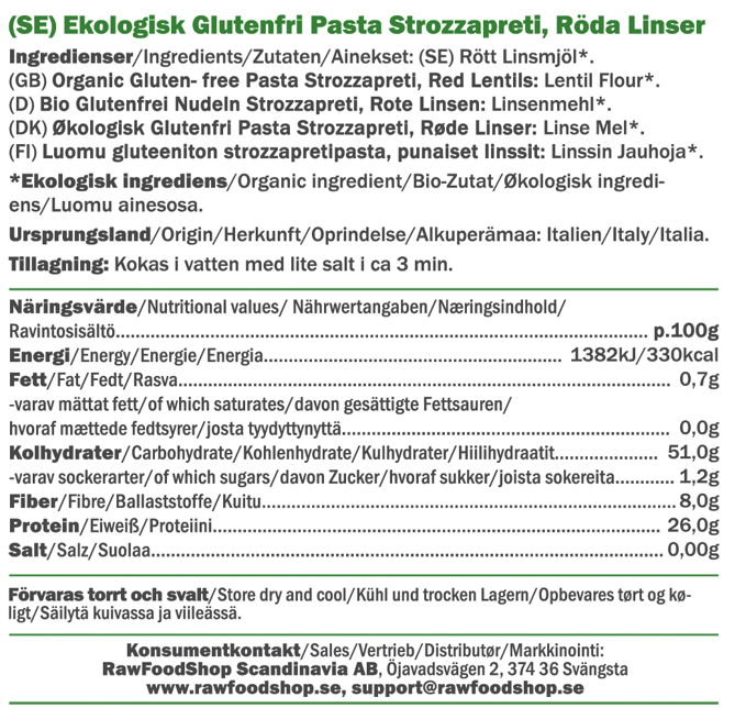 Med vores Strozzapreti med røde linser får du nye muligheder i køkkenet. Mangler du inspiration til en opskrift med linsepasta? Forestil dig en cremet tomatsauce med friske krydderurter, ovnbagte grøntsager – eller måske en frisk citronsauce med hvidløg. Den milde og runde smag gør, at linsepastaen passer til det hele. Og det bedste af det hele? Den er nem og hurtig at tilberede – klar på få minutter. Uanset om du er en passioneret hjemmekok eller bare vil lave noget hurtigt og lækkert efter arbejde, er denne pasta et oplagt valg. Økologisk, plantebaseret og uden unødvendige tilsætningsstoffer – præcis som det bør være.