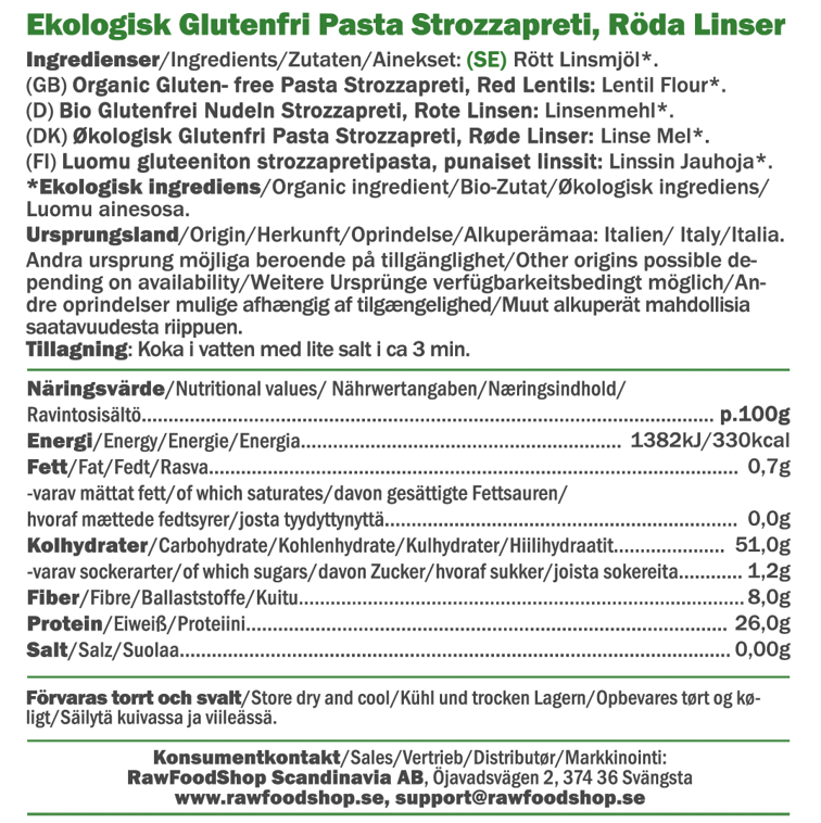 Pasta Strozzapreti Røde Linser ØKO er det ideelle valg for dig, der gerne vil nyde en naturlig og smagfuld erstatning for almindelig pasta. Denne linsepasta er lavet udelukkende af økologiske røde linser – intet andet. Derfor er den både glutenfri og 100% vegansk, hvilket gør den oplagt til alt fra plantebaserede retter til nemme hverdagsmåltider for hele familien. Den har en skøn, fyldig konsistens, som holder sig fast og lækker efter kogning – perfekt til både varme gryderetter og friske pastasalater.