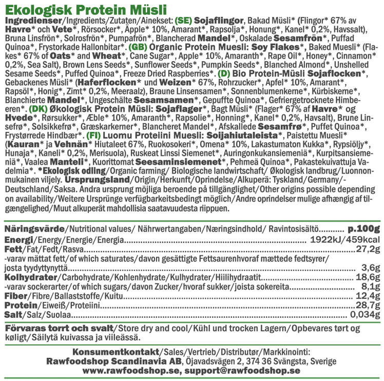 Leder du efter en lækker og balanceret start på dagen? Vores Proteinmysli ØKO er svaret! Med hele 30% protein og en farverig blanding af sprøde sojaflager, frø, mandler, puffet quinoa og nærende gryn som amarant – alt sammen toppet med tørret frugt og frysetørrede hindbær – får du en morgenmad med både crunch og sødme i hver eneste ske. Denne gennemtænkte sammensætning giver dig masser af variation og gør müslien til et oplagt valg, uanset om du nyder den med mælk, plantebaseret drik eller som topping på din yoghurt eller smoothie bowl. Og selvfølgelig er alt økologisk – nøje udvalgt med omtanke for både smag, kvalitet og natur. Start dagen stærkt – med en müsli, der virkelig gør en forskel.