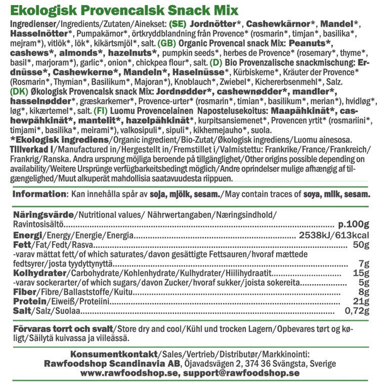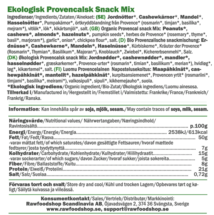 Provencal Snackmix ØKO er en lækker, økologisk blanding af nødder og kerner, smagt til med den klassiske krydderiblanding "herbes de Provence" – en aromatisk sammensætning af urter, der sender tankerne direkte til solrige marker i Sydfrankrig. Denne veganske snack er det oplagte valg for dig, der elsker smagfulde, naturlige snacks med lidt ekstra karakter. Med et generøst mix af jordnødder, cashewnødder, mandler, hasselnødder og græskarkerner får du både knas og variation i hver eneste mundfuld. Brug den som en elegant snack til aperitiffen – eller drys den over en frisk salat for at give et sprødt og smagsrigt løft.