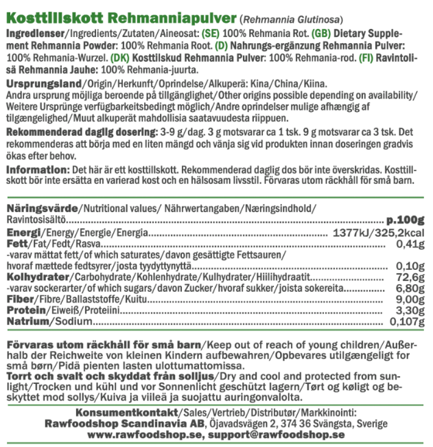 Vores rehmannia-pulver er et vegansk kosttilskud, fremstillet af 100% ren rehmannia-rod (Rehmannia glutinosa) – intet andet. Rent, enkelt og helt plantebaseret. Perfekt til dig, der ønsker et naturligt kosttilskud, som passer ind i en hverdag med fokus på rawfood, økologiske valg og vegansk madlavning. Pulveret er nemt at dosere og kan tilsættes alt fra smoothies til te.