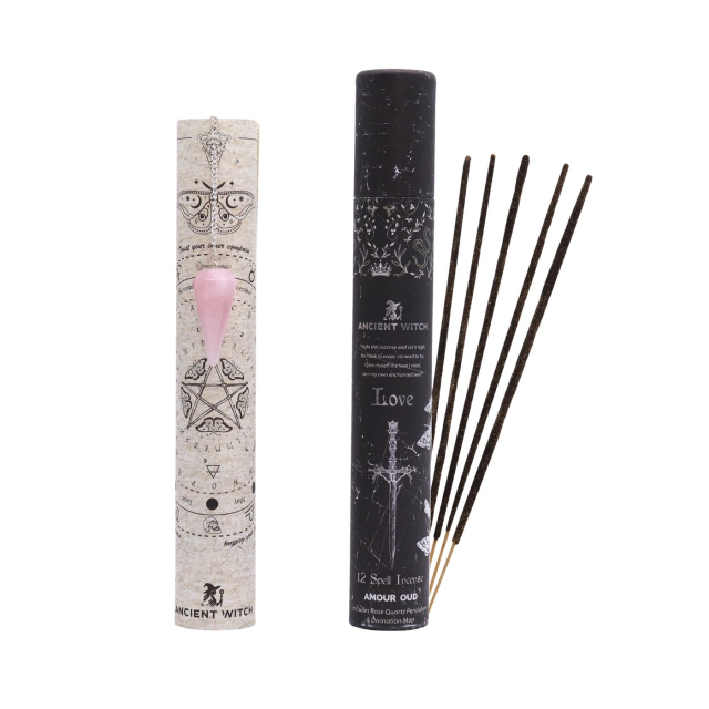 The Love Spell Incense er et følelsesfuldt ritualesæt, der inviterer kærlighed, indre heling og hjertets åbning. Sættet indeholder tolv røgelsespinde med en blød, blomsteragtig duft, et rosakvarts-pendul og et spådomskort – alt præsenteret i et smukt rør med moderne, symbolsk design.