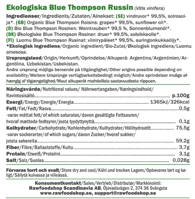 Økologiske Blue Thompson-rosiner er mørke, søde rosiner, der kommer fra omhyggeligt udvalgte og modne druer. Disse økologiske rosiner er helt naturlige, uden tilsat sukker eller kunstige tilsætningsstoffer. Med deres rige smag og fyldige tekstur er de perfekte at nyde, som de er – direkte fra posen – eller som et herligt indslag i din yndlingsgranola. Uanset om du vil have noget lækkert at spise på farten eller har brug for et ekstra touch til din hjemmebagning, er disse rosiner et fremragende valg.