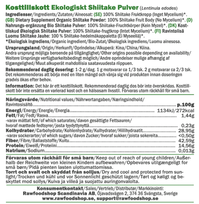 Shiitake Pulver ØKO er et økologisk, vegansk kosttilskud fremstillet af 100 % shiitake-frugtlegemer, helt uden mycelium. Shiitake-svampen, også kendt som "kejseren af svampe", er værdsat for sin dybe og rige smag. En nænsom tørre- og maleproces bevarer svampens naturlige egenskaber, hvilket gør den til en fremragende del af en afbalanceret kost.
