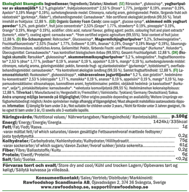 Uanset om det er til fredagshygge, en picnic eller en børnefødselsdag, er dette økologiske skumslik perfekt. Den praktiske 100-grams emballage er nem at tage med og dele med familie og venner – eller at nyde selv som lidt hverdagsluksus. Med yoghurtgums, der smelter i munden, og en subtil smag af frugt er hver bid en lille påmindelse om, hvor lækkert og naturligt slik kan være. Vælg vores økologiske skumslik for en velsmagende og omhyggeligt fremstillet godbid, der gør enhver anledning lidt sjovere og lidt lækrere!