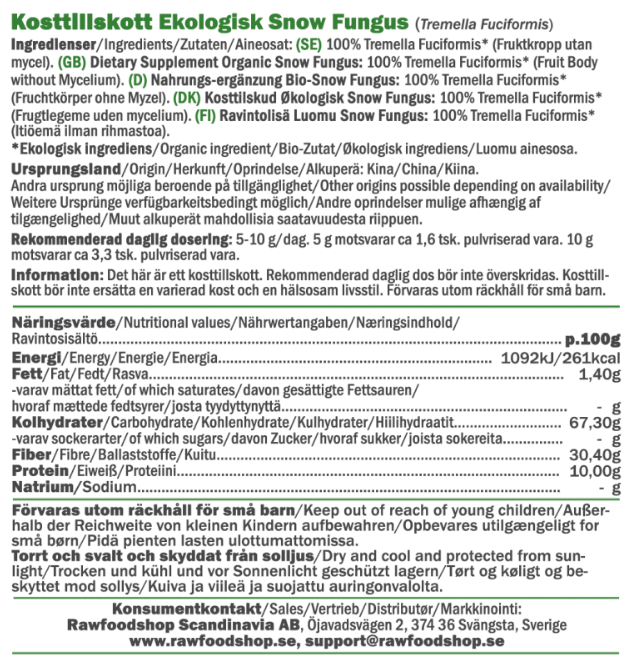 Kosttilskuddet stammer fra økologisk dyrkede tremella-svampe. Det er nemt at bruge og integrere i din daglige kost, uanset om du foretrækker at tilsætte det i en drik eller bruge det som en ingrediens i madlavningen.