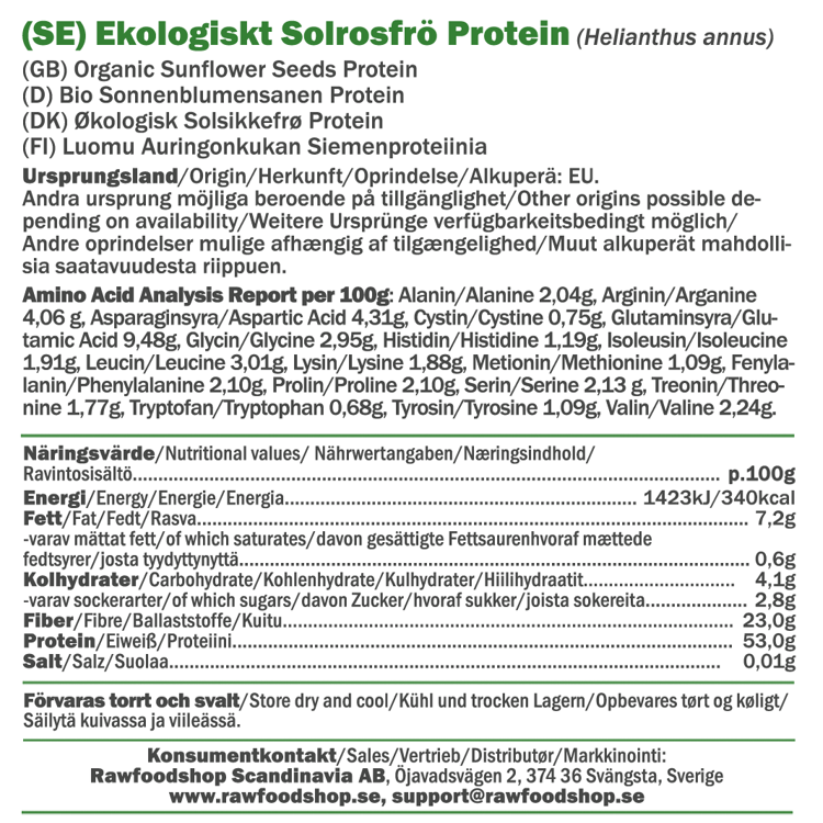 Solsikkefrø Protein ØKO – et økologisk og vegansk proteinpulver, der giver dig en naturlig måde at supplere din kost på. Fremstillet af nøje udvalgte solsikkefrø er dette veganske proteinpulver et fremragende produkt for dig, der ønsker en alsidig ingrediens i din madlavning. Med sin milde smag og fine konsistens passer solsikkeprotein i mange sammenhænge. Du kan nemt tilsætte det i alt fra juicer og supper til smoothies og energibarer.
