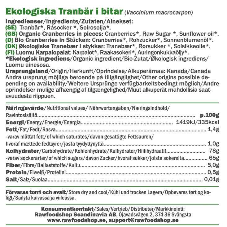 Vores økologiske, tørrede tranebær er et naturligt og smagfuldt indslag i din hverdag. Tranebærrene er fantastiske i frugt- og nøddeblandinger, hvor de bidrager med både farve, tekstur og en dejlig smagsbalance. Perfekte at have med på farten, som en snack eller til en hyggelig udflugt! Sammen med nødder og andre tørrede frugter skaber de en kombination, der både føles luksuriøs og naturlig.