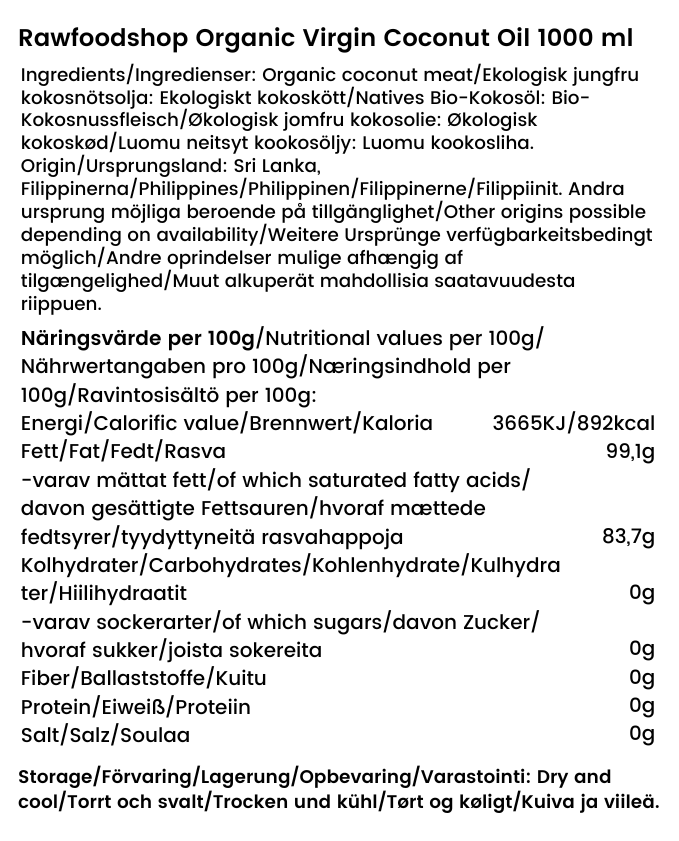 Denne økologiske kokosolie er virgin og raw, hvilket betyder, at den er koldpresset og fremstillet uden varmebehandling for at bevare sin naturlige kokossmag og duft. Vores økologiske kokosolie er certificeret i henhold til EU Organic-standarden, hvilket garanterer et højkvalitetsprodukt, der er fri for syntetiske pesticider og kunstgødning. Perfekt til dig, der søger en alsidig olie til både madlavning og hudpleje.