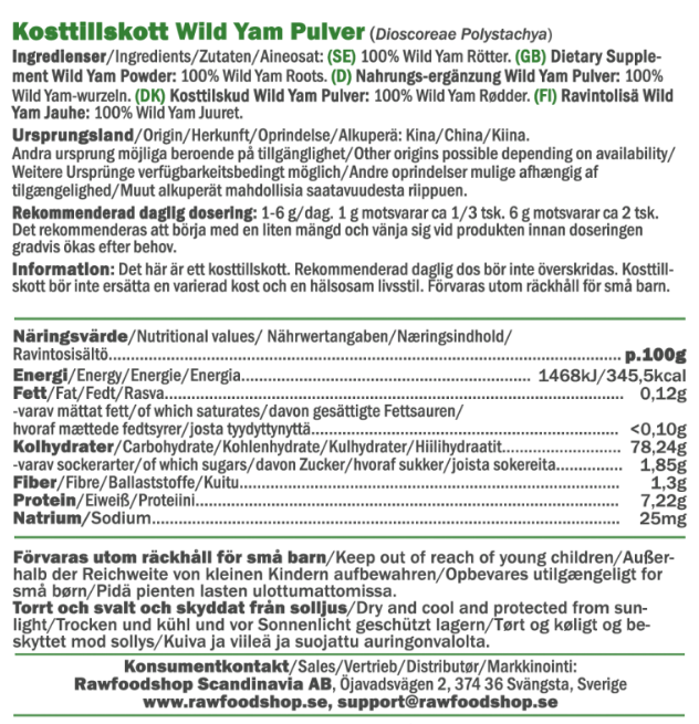 Wild yam (Dioscorea polystachya), også kendt som kinesisk jams, er en klatreplante, der vokser i Østasien og dele af Kina. Dette pulver er fremstillet af nøje udvalgte, økologiske afgrøder og tørret skånsomt for at bevare plantens naturlige karakter. Som økologisk kosttilskud er det et naturligt valg for dig, der foretrækker produkter uden unødvendige tilsætningsstoffer.